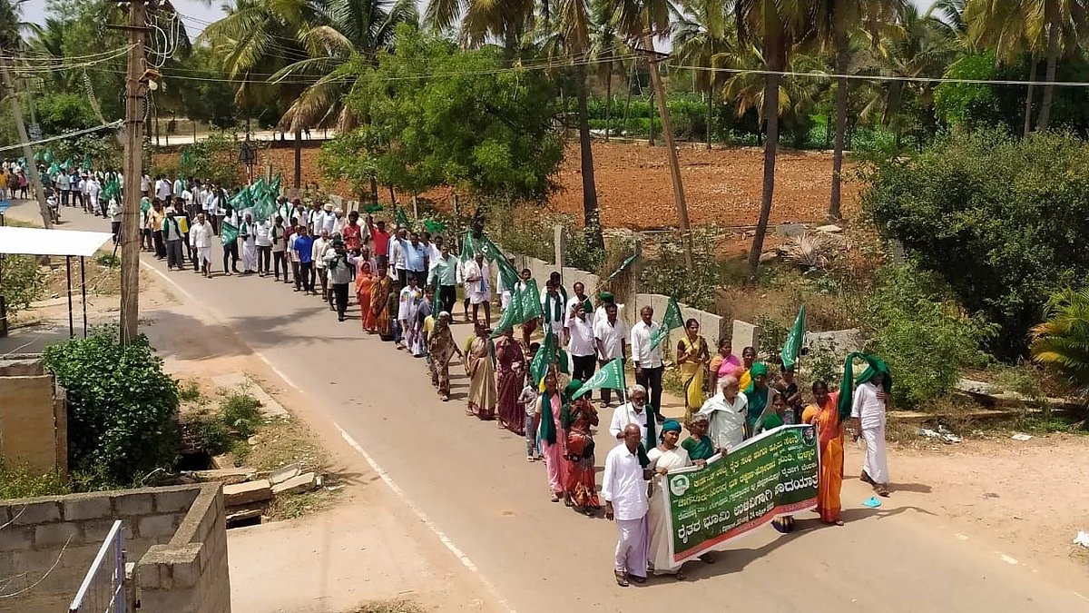 The “Devanahalli Chalo” protest on June 25 saw farmers, joined by Dalit organizations, women’s groups, and students, rally at Devanahalli’s tahsildar office under tight police security. Placards reading “Save Our Land” and chants of “Jameen ichishi, deshantram povalna” (Should we give up land and leave our homes?) echoed through the streets, reflecting the farmers’ resolve to protect their “motherland.” Spiritual leaders like Sanehalli Panditaradhya Shivacharya Swamiji also expressed solidarity, amplifying the movement’s reach.